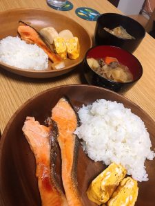 鮭が少しかじられているように見えるのは私の弁当に取り除いた後です🍱